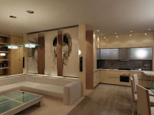 Рабочую зону кухни можно выделить при помощи освещения. В этом случае в гостиной делается центральное освещение при помощи люстры, а на кухне располагают точечные светильники.