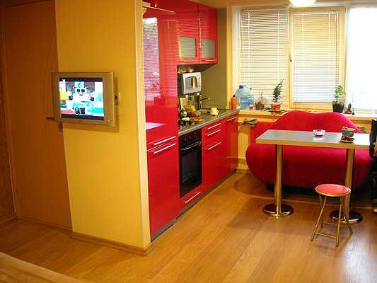 В процессе перепланировки частично или полностью сносится стена между кухней и комнатой, и получается довольно просторное общее пространство