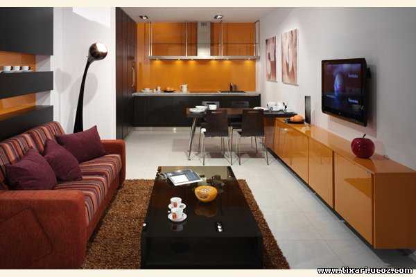 Интерьер кухни, совмещенной с гостиной, в хрущевке желательно не просто осовременить, но и придать каждой его детали некую полезную нагрузку: если хотите несколько оградить кухонную зону от гостиной, то разместите на перегородке телевизор-плазму, или разделите кухню и гостиную барной стойкой, или организуйте зеленую изгородь из комнатных растений. Распланируйте пространство таким образом, чтобы место не «гуляло», чтобы каждый декоративный элемент был еще и функциональным – для маленьких квартир это очень важно.
