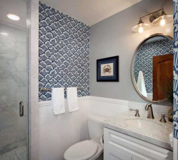 - Фрагмент стены, оклеенный виниловыми обоями с неярким вертикальным узором, гармонирует с выложенными однотонной плиткой поверхностями.