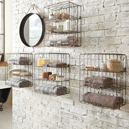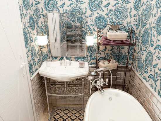 Если же вам совсем не по душе скучные однотонные стены, можно попробовать вариант, как на следующих фото. Отделку подбираем с принтом, но вот места для хранения организуем по-другому. Вместо закрытых ящиков и шкафов, которые «съели» бы и без того дефицитное пространство, используем открытые металлические этажерки. Кроме того, зеркало сюда лучше подобрать без рамы, либо она должна быть очень узкой.