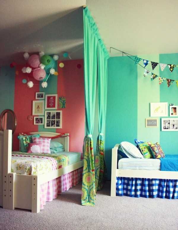 Если в дизайне комнаты четко прослеживается идея обозначить, что эта комната принадлежит двум маленьким хозяевам, можно изначально окрасить ее стены в два разных цвета с упором на девчоночьи цвета (розовая палитра) и голубой цвет для мальчика.