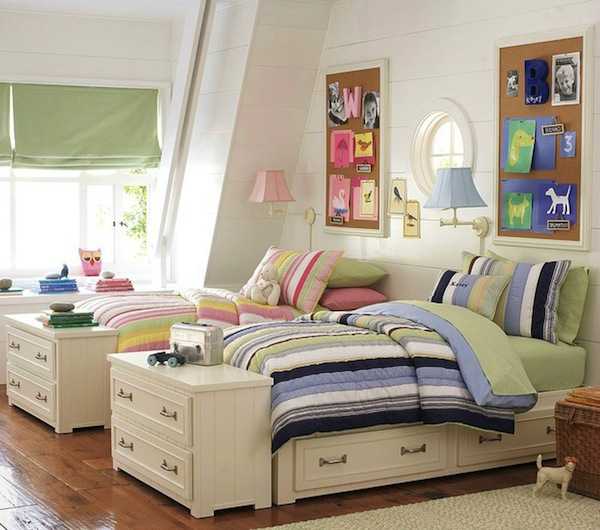 Условно можно разделить детскую комнату на мальчиковую и девичью, поставив кровати разнополых детей по разным углам и сторонам комнаты, дополнив оформление каждой части собственным комодом или шкафом для хранения вещей.