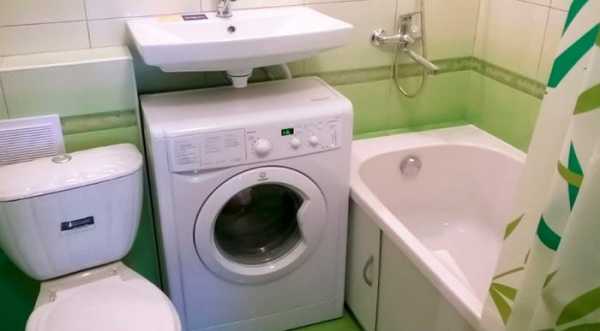 В ванной комнате с ванной, свободной площади практически не остается, поэтому здесь используется другой вариант. В данном случае узкую стиральную машину ставят под умывальник. При этом раковину приподнимают, для размещения слива.