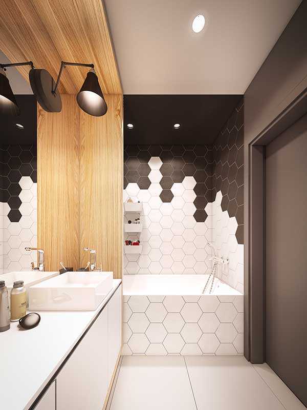 Особой изюминкой всего интерьера являются открытые ниши, декорированные геометрическим орнаментом, в которые можно расставить свечи, создавая особую романтическую атмосферу или необходимые ванные принадлежности. Стеклянная перегородка разделяет пространство на две функциональные зоны, практически незаметная, она выглядит легкой и воздушной.