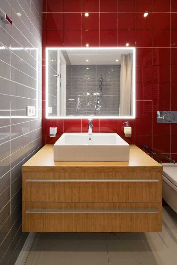 Можно добавить подсветку зеркал. Само освещение должно быть матовым или приближенным к дневному свету. Но, ни в коем случае не ярко белым, бьющим в глаза.