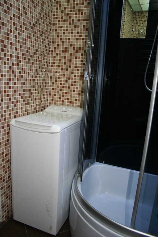 Если в помещении устанавливается душевая кабина, то освобождается место, на которое встанет «стиралка». Лучше всего рядом с умывальником, чтобы шланги были незаметны при эксплуатации.