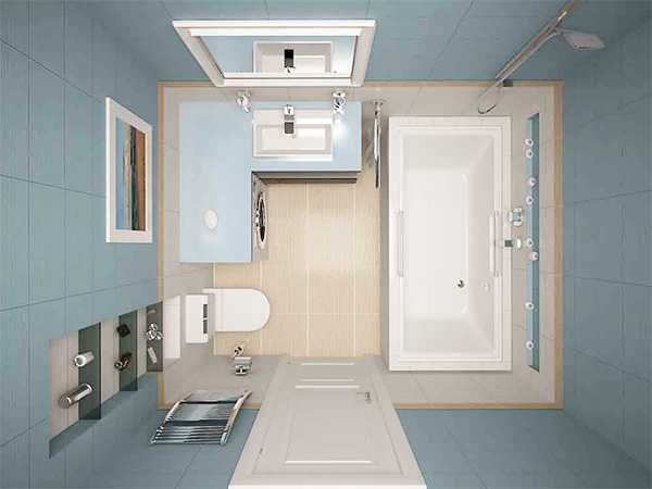 Однако, если комната выполнена в форме квадрата, появляются дополнительные варианты. Например, ванну и умывальник расположить в одном углу, душ, унитаз, машинку-автомат – в другом.