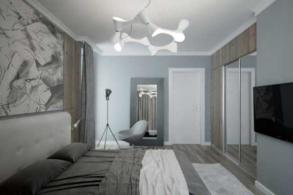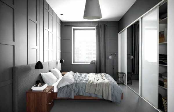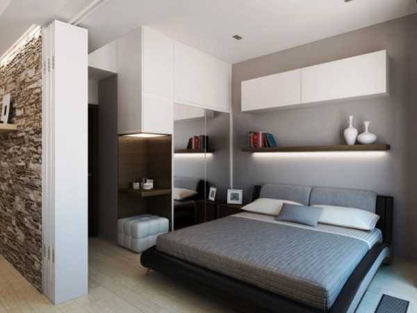 Современный дизайн спальни в малогабаритном помещении обязывает выделить место для гардеробной, где с удобством разместятся все вещи.