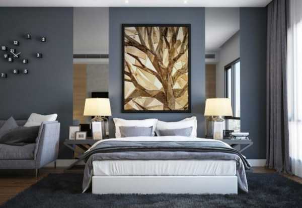 При оформлении стен спальни основной акцент делается на место вокруг изголовья кровати. Именно здесь будут наиболее выгодно смотреться крупные картины, коллажи, или отделка контрастным цветом или материалом с другой фактурой. Таким образом, удается дополнительно подчеркнуть основное предназначение помещения, сделав акцент на зоне отдыха.