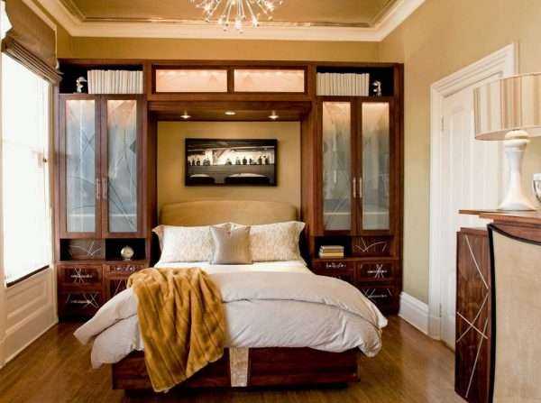 Для маленькой спальни кровать можно расположить в нише между двумя шкафами, соединенными антресолью.