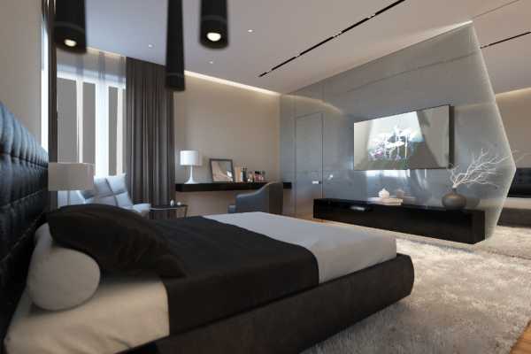 Основной идеей современной спальни является сочетание максимальной функциональности и комфорта с минимальным количеством предметов мебели и декора. Сочетание правильных геометрических форм с волнообразными элементами декора позволяет визуально расширить границы пространства.