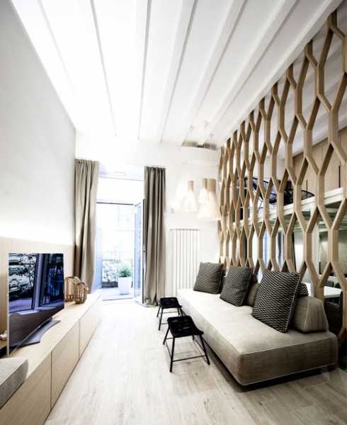 Очень часто в качестве перегородок используется сама мебель либо стеллажи. В 2019 году станет популярным ещё один вариант, который представляет собой деревянную решётку из натуральных материалов. Она бывает всевозможных форм и размеров, исполнена в классическом стиле, либо сделана под какой-то оригинальный мотив. Выглядит очень стильно и необычно.