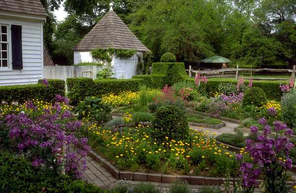 Что касается выбора растений, то здесь обычные цветы и кустарники следует совмещать с различными плодовыми сортами деревьев. Это связано с тем, что первые колониальные сады (еще в XV веке) имели чисто практическое предназначение, то есть деревья высаживали с целью получения плодов. При выборе цветов стоит обратить внимание на тюльпаны, нарциссы и пионы.