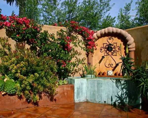 Основу испанского ландшафта составляют засухоустойчивые растения. Широко используется керамическая плитка, при помощи ее создаются практически любые малые архитектурные формы и элементы дизайна, такие как: встроенные скамейки, фонтаны, водоемы, подпорные стенки, дорожки, и прочее. Большие терракотовые горшки с ярко-синей глазурью – также обязательный элемент декора.