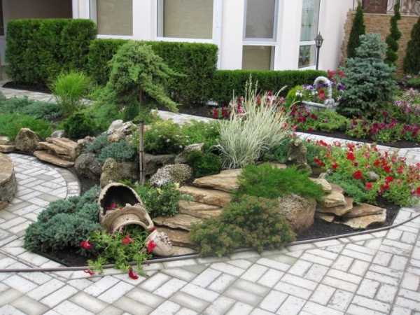 - Красиво украшенные бетонные подпорки, дорожки в светлых тонах из щебня или гальки, стальные окантовки, выкрашенные в эффектные, но не броские цвета, удачно впишутся в композиции.
