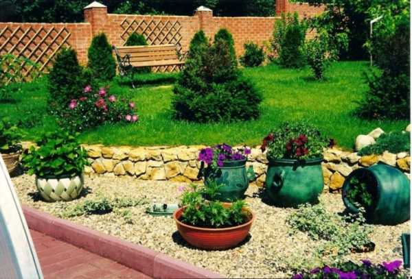 Самое важное – стараться использовать только натуральные материалы, камень или дерево. Это может быть декоративная изгородь, лавочка из целого бревна и тому подобное. Также в качестве вазонов для цветов можно использовать бочки, старые элементы мебели и многое другое.