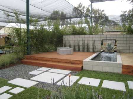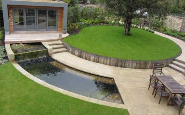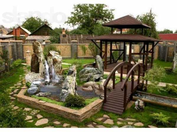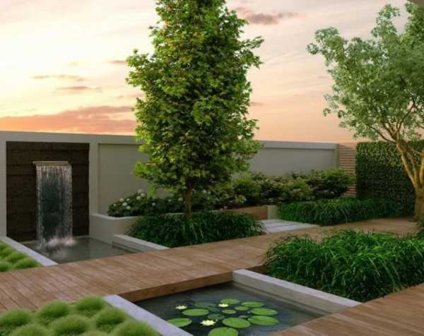 - Особенную роль играют водоемы. Желательно, чтобы был хотя бы небольшой декоративный фонтан. Если же обустроить зону искусственным прудом, будет еще лучше.