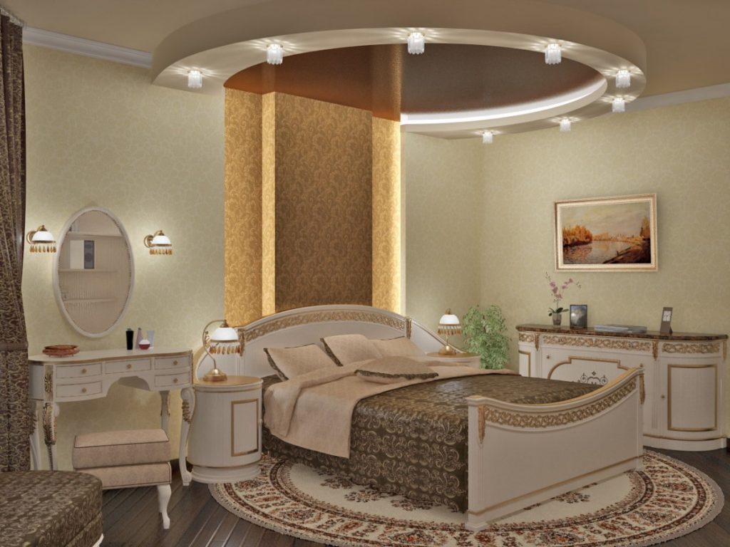 На сегодняшний день достаточно популярен потолок из гипсокартона в спальне, который может быть одноуровневым по типу подвесного или многоуровневым.