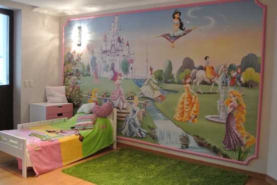 - Сюжеты из детских сказок и мультиков – хорошее решение для оформления детской спальни. Они могут быть нарисованы на стенах или размещены постерами на стенах.