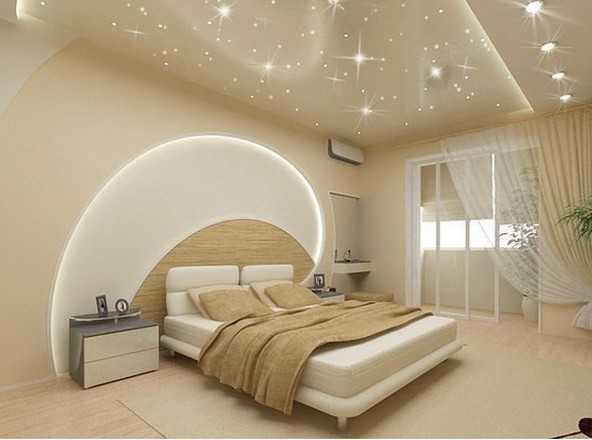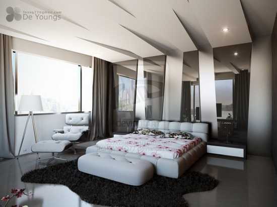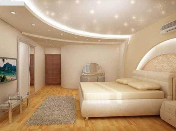 Посмотрите фото удачных примеров потолка из гипсокартона в спальне.