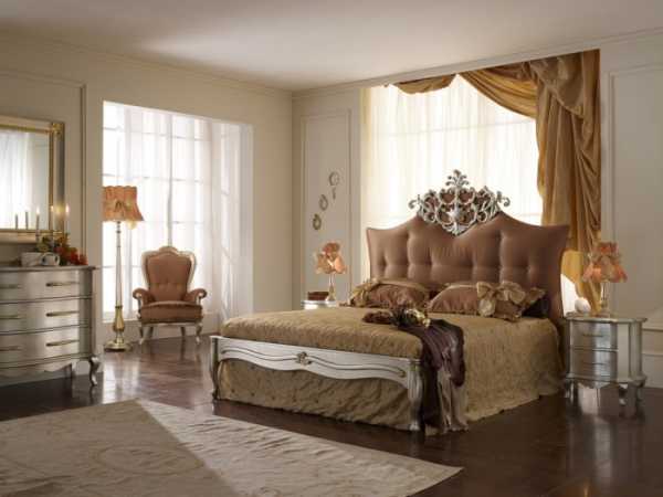 Если помещение просторное, то кровать может выделяться декоративным изголовьем и балдахином. Кроме того, эту зону можно дополнить комодом, статуэтками и вазами.