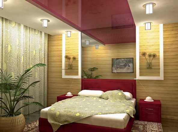 Быстро и недорого скрыть неровности, спрятать электропроводку и коммуникации можно с помощью установки гипсокартона. Кроме того, его можно использовать для создания оригинального многоуровневого потолка. Пересматривая ремонт спальни на фото, часто можно заметить использование натяжных потолков из тканевых полотнищ. Они не только привлекательно выглядят, но и удобны в эксплуатации.