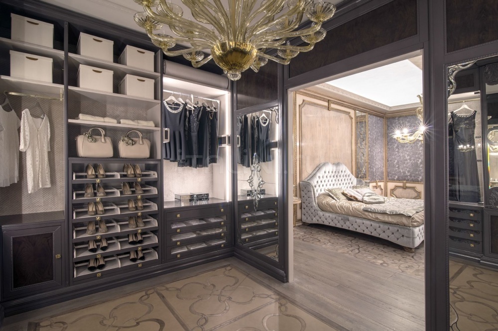 Особое внимание уделяется функциональности выбираемых предметов мебели. Нередко в гардеробной размещают пуф или даже кресло.