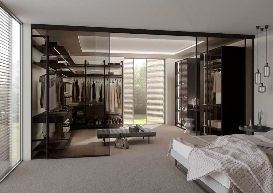 Подобные гардеробные могут устраиваться в любой спальне, независимо от ее площади. Все вещи хранятся открытым способом, так как отсутствуют какие-либо двери и ограждения. Такие системы являются частью спальни, гармонично вписываясь в интерьер. Однако выбор в пользу подобной конструкции делается редко, так как не каждый способен поддерживать идеальный порядок в гардеробной.
