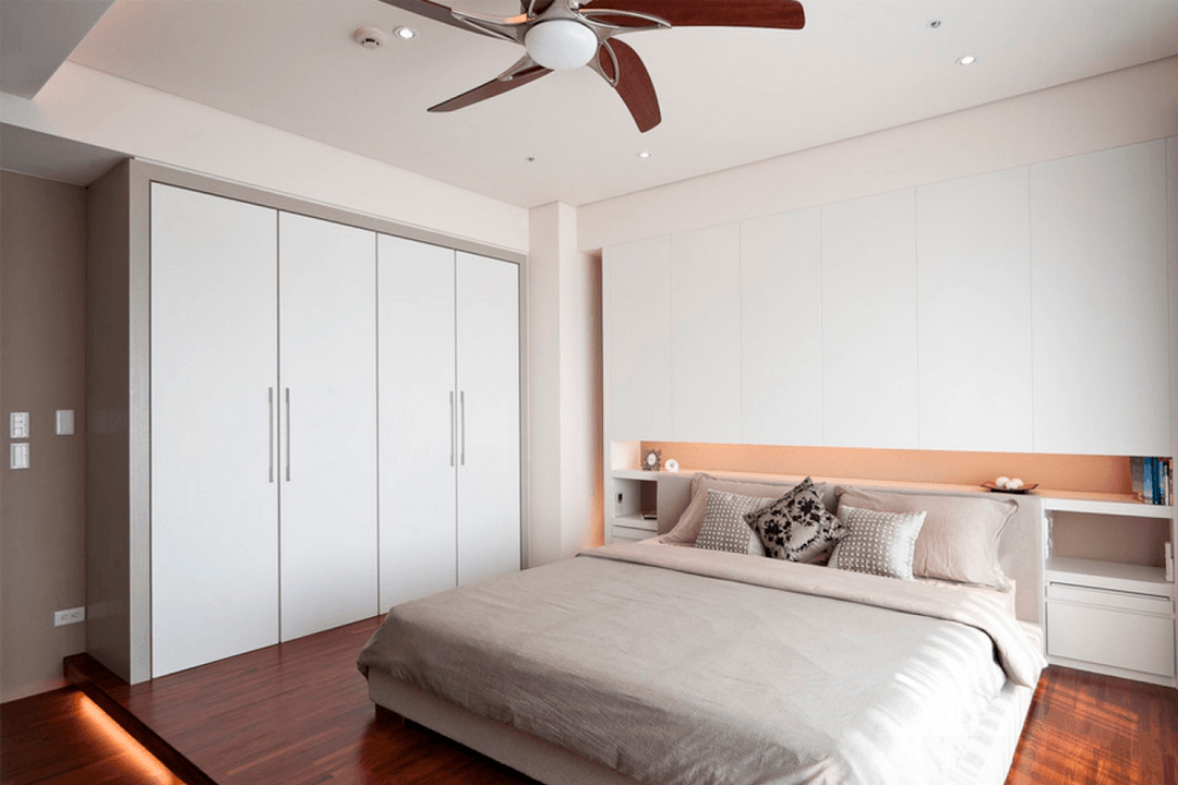 Осветительные приборы, установленные в спальне, не способны обеспечить достаточный уровень освещения находящихся внутри полок. Поэтому стоит обязательно позаботиться о наличии дополнительный лам и светильников.