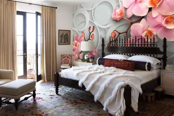 На фото – пример интерьера спальни с орхидеями на фотообоях: