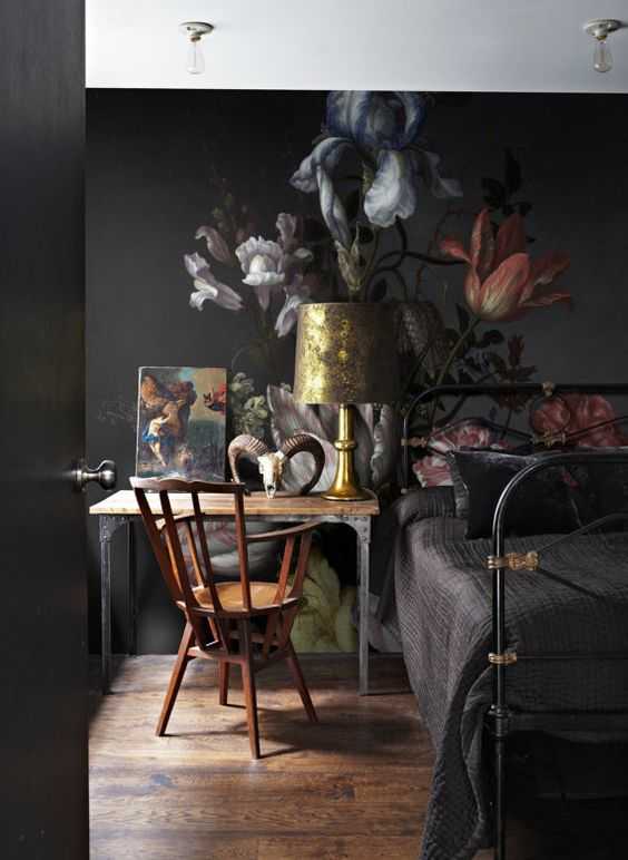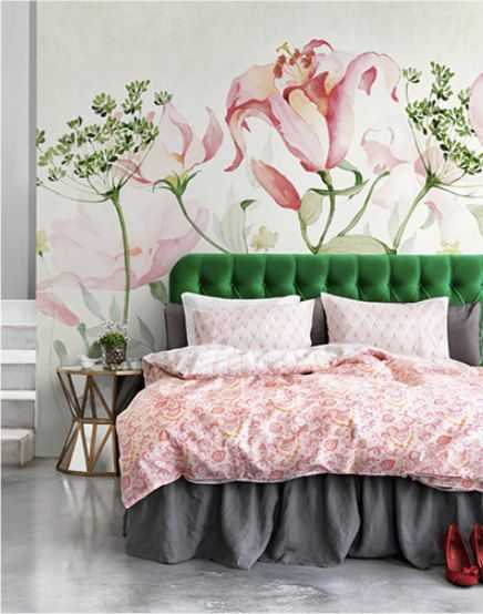 Выше – удачное фото спальни с изображением цветов над кроватью.