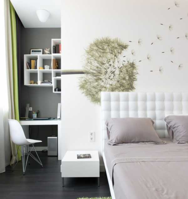 Для комнат, имеющих нестандартную геометрическую конфигурацию, использование фотообоев станет настоящей находкой. Если в торце узкого помещения поклеить полотна с изображениями, выполненными макросъемкой (например, цветами), то сформируется эффект расширения пространства, и спальная комната перестанет быть похожей на тесный коридор.