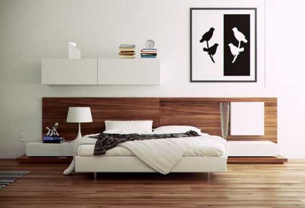 Эффектно выглядит кровать с мягкой спинкой, отделанной кожей. Среди самых удачных вариантов декорирования каркаса отметим древесину (актуальна любая палитра — как светлая, так и темная) и белый глянец.