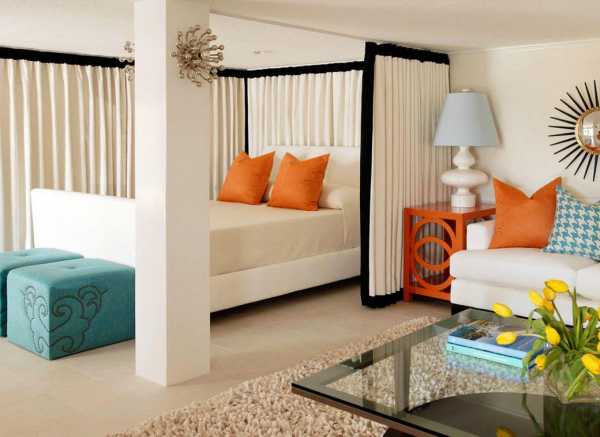 Добиться зонирования можно при использовании контрастных цветов. К примеру, стены в спальной зоне вы можете окрасить в белый или бежевый, а стены в гостиной отделать при помощи черного или темно-коричневого.