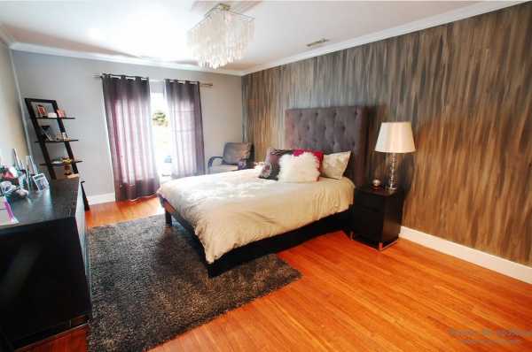 Рекомендуем хорошо подумать над сочетанием материалов для отделки стен: при помощи орнаментированных либо однотонных обоев в сочной палитре можно акцентировать внимание на определённой зоне. Создайте эффектное оформление, выделив, таким образом, зону рядом с кроватью.