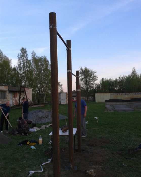 ΠΠ»Ρ ΠΈΠ·Π³ΠΎΡΠΎΠ²Π»Π΅Π½ΠΈΡ Π±ΡΡΡΡΠ΅Π² Π΄Π»Ρ Π½Π°ΡΠ΅ΠΉ ΡΠΏΠΎΡΡΠΈΠ²Π½ΠΎΠΉ ΠΏΠ»ΠΎΡΠ°Π΄ΠΊΠΈ Π½ΡΠΆΠ½Ρ ΠΌΠ΅ΡΠ°Π»Π»ΠΈΡΠ΅ΡΠΊΠΈΠ΅ ΡΡΡΠ±Ρ Π΄Π»Ρ ΠΎΠΏΠΎΡ Π΄ΠΈΠ°ΠΌΠ΅ΡΡΠΎΠΌ 6 ΡΠΌ, Π΄Π»Ρ ΠΏΠ΅ΡΠ΅ΠΊΠ»Π°Π΄ΠΈΠ½ β 4 ΡΠΌ. ΠΠ° ΡΠ΅ΡΡΠ΅ΠΆΠ΅ Π½ΠΈΠΆΠ΅ ΡΠΊΠ°Π·Π°Π½Ρ ΡΠ°Π·ΠΌΠ΅ΡΡ ΡΠ½Π°ΡΡΠ΄Π°. Π Π°ΡΡΡΠΎΡΠ½ΠΈΠ΅ ΠΌΠ΅ΠΆΠ΄Ρ ΠΏΠ΅ΡΠ΅ΠΊΠ»Π°Π΄ΠΈΠ½Π°ΠΌΠΈ Π΄ΠΎΠ»ΠΆΠ½ΠΎ Π±ΡΡΡ 0,5β0,6 ΠΌ. ΠΠΏΠΎΡΠ½ΡΠ΅ ΡΡΡΠ±Ρ Π²ΠΊΠ°ΠΏΡΠ²Π°ΡΡ Π² Π·Π΅ΠΌΠ»Ρ Π½Π° Π³Π»ΡΠ±ΠΈΠ½Ρ Π΄ΠΎ 0,6 ΠΌ. ΠΠΎΡΡΠΎΠΌΡ Π²ΡΡΠΎΡΡ ΡΡΠΎΠ΅ΠΊ Π½ΡΠΆΠ½ΠΎ Π²Π·ΡΡΡ Ρ Π·Π°ΠΏΠ°ΡΠΎΠΌ. ΠΠ° ΡΠ΅ΡΡΠ΅ΠΆΠ΅ ΡΠΊΠ°Π·Π°Π½Π° Π²ΡΡΠΎΡΠ° Π΄ΠΎ Π·Π΅ΠΌΠ»ΠΈ, ΡΠ»Π΅Π΄ΠΎΠ²Π°ΡΠ΅Π»ΡΠ½ΠΎ, Π΅Ρ Π½ΡΠΆΠ½ΠΎ ΡΠ²Π΅Π»ΠΈΡΠΈΡΡ Π½Π° 60 ΡΠΌ.