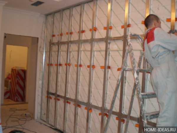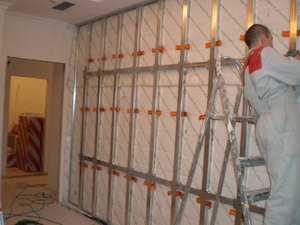 Вначале монтируется каркас из стальных профилей. Для того чтобы исключить передачу вибраций от стен и пола, в местах крепления профилей необходимо сделать прокладки из резины или другого упругого вещества. После того, как каркас будет готов, на стену клеится звукопоглощающий материал, который должен покрывать всю ее поверхность, при этом, чем толще его слой, тем эффективнее шумоизоляции. Затем к каркасу прикручиваются листы гипсокартона.