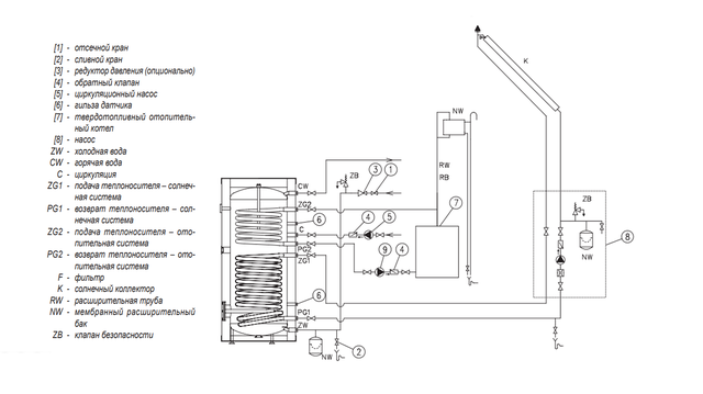 Подключение бойлера выполняется контуром, параллельному отопительному контуру, в который встраивается независимый циркуляционный насос — благодаря этому достигается независимость горячего водоснабжения от отопительной системы.