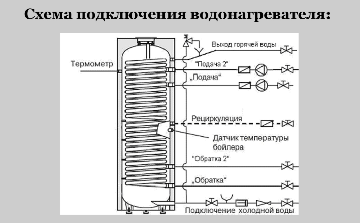 Бойлер косвенного нагрева связан с трубопроводом, через который теплоноситель попадает в котел для очередного нагрева.