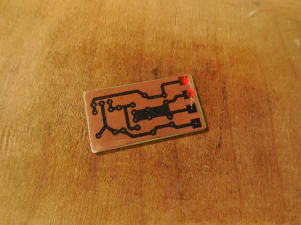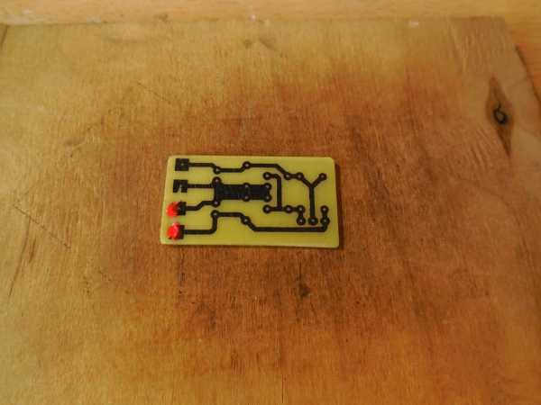 Вся схема собирается на небольшой печатной плате размерами 35 х 20 мм, изготовить которую можно методом ЛУТ. Печатная плата полностью готова к печати, отзеркаливать её не нужно. Ниже представлены несколько фотографий процесса.