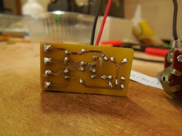 Дорожки желательно залудить, это уменьшит их сопротивление и защитит от окисления. Когда печатная плата готова – начинаем запаивать детали. Микросхема запаиваться прямо на плату, спинкой в сторону края. Такое расположение позволяет закрепить на радиаторе всю плату с микросхемой.