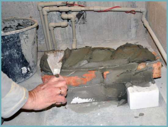 - Надежный способ установки стальной ванны. Называя этот способ сложным, я, наверное, немного погорячился – на самом деле он простой, но требует умения работать с кирпичной кладкой. По сути, эта технология предусматривает укладку ванны на ее борта – для этого понадобится выложить из кирпича минимум четыре столбика, на которые она и будет опираться. Кроме того, так же как и в первом случае, под днищем этого сантехнического прибора понадобится обустроить кирпичную подушку. Вся сложность заключается в том, чтобы и столбики, и сама подушка находились на определенной фиксированной высоте от пола. Решить этот вопрос можно с помощь раствора – это несложно, достаточно только немного оштукатурить низкие столбики нужным слоем раствора. С подушкой поступают точно так же как и в первом случае.
