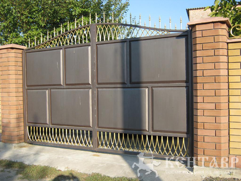 - Из профнастила с элементами ковки. Отличаются прочностью и долговечностью, профнастил предлагается в самых разнообразных цветовых решениях, дизайн изделий тоже может быть различным.