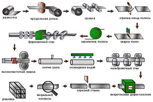 - Сварка кромок производится с помощью высокочастотной сварки. Кромки заготовки нагреваются индуктором до температуры плавления, а потом сдавливаются обжимными роликами. Другой способ, когда кромки нагреваются с помощью высокочастотного генератора, ток подается на кромки с помощью контактов.