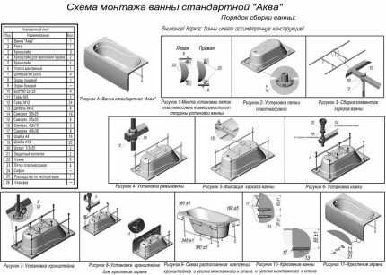Собранный каркас до монтажа и корректировки высоты акриловой ванны от пола с ножками помещают в середине центра днища чаши, которая находится на полу в перевернутом виде. К каркасу прикрепляют ножки. Две опоры размещают под дном, две – вдоль стены комнаты и три – по переднему краю.