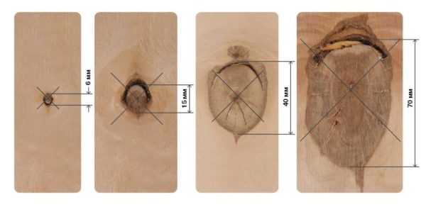 - здоровые, сросшиеся, темные и светлые диаметром 15 мм не более 10 шт/м², в них могут быть трещины шириной не более 0,5 мм;