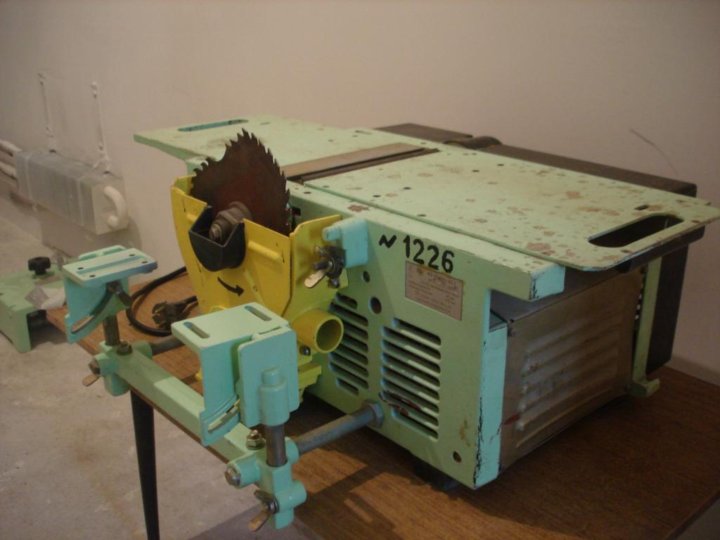 Установив на посадочную шейку станка вместо пилы абразивный отрезной диск, можно с помощью поворотного кронштейна выполнять резку металлических профилей – труб, уголков и тому подобное. Иногда на комбинированных станках производят заточку инструмента, заменив пилу на абразивный круг. Выполнение подобных операций без специальной оснастки и надежных ограждений режущего инструмента и зоны резания категорически запрещается. Как правило, подача заготовок на комбинированном станке осуществляется вручную. Но существуют станки, на столе которых монтируется съемный вальцовый автоподатчик, позволяющий механизировать подачу заготовок при их продольной обработке – фуговании, фрезеровании или пилении.