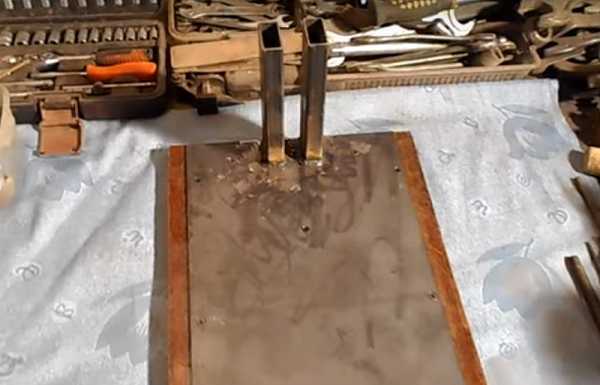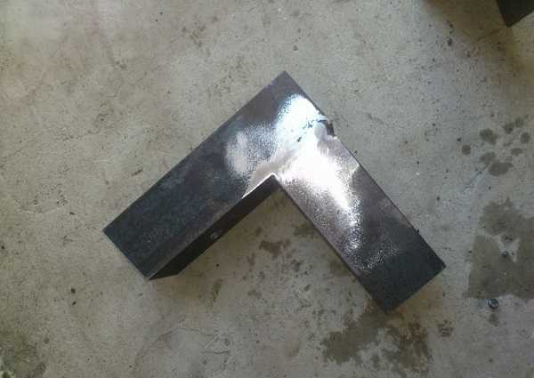 Переходим к сборке основания. Его размеры 46,5×40 см. Чтобы не тратить деньги на покупку новых труб и уголков, воспользуемся металлоломом, все равно после сборки детали будут окрашиваться. Задняя часть основания состоит из двух квадратов 25×25 мм, а передняя из одного. По бокам приварены два уголка того же сечения. С отступом в 10 мм от боковых частей зафиксируем тавры 35×25 мм. К задней части основания привариваем два 40 мм уголка-стойки длиной 32,5 см на расстоянии 9,2 см друг от друга. С внутренней части вертикальных уголков просверливаем отверстия под крепления держателей. Между собой стойки соединяем пластиной, которая приваривается к прямым углам опор.