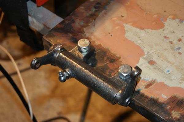 К металлическому штоку амортизатора необходимо приварить проушины, к которым в последующем будет крепиться болгарка или пила-торцовка. Предварительно следует выполнить такие монтажные проушины по размерам имеющегося у вас инструмента и сделать в металлических скобах соответствующие отверстия для крепления углореза.